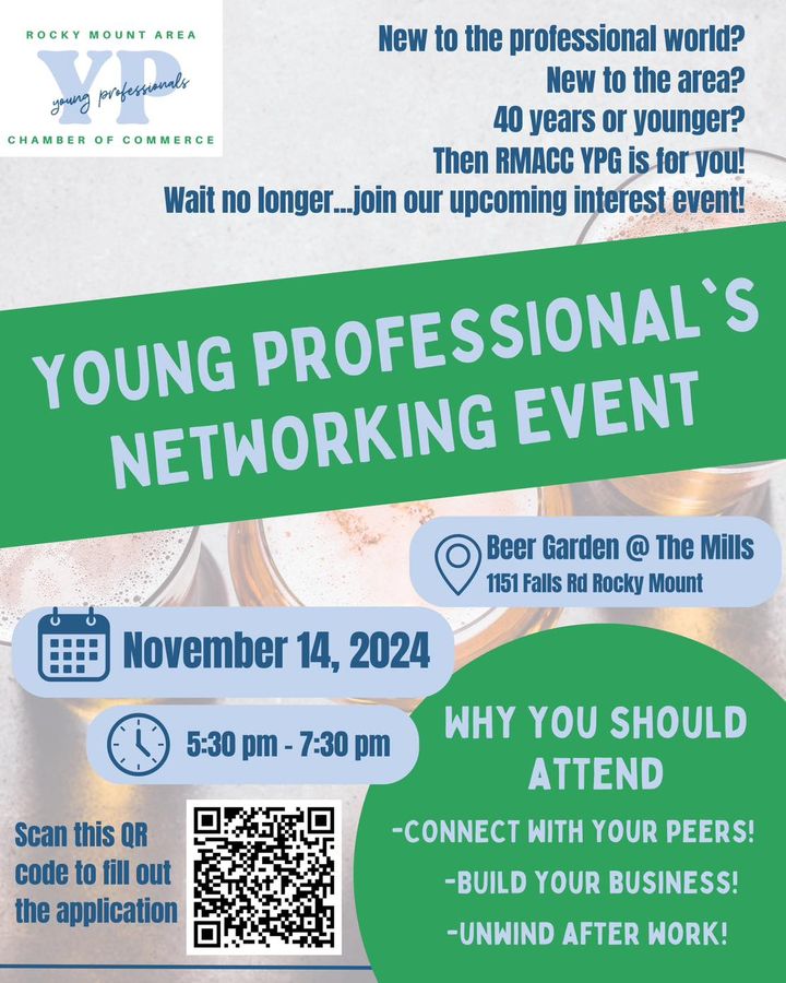 A Young Professionals Networking Event is scheduled for November 14, 2024, from 5:30 pm to 7:30 pm at the Beer Garden @ The Mills, located at 1151 Falls Rd in Rocky Mount. The event is aimed at individuals who are 40 years old or younger and are either new to the professional world or the area.